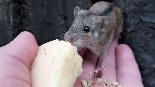 Дикая мышь, ест сыр у меня на ладони