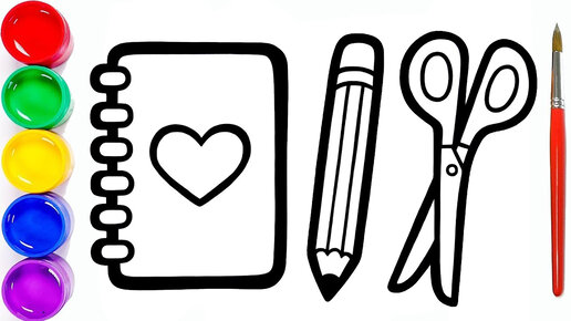 Как нарисовать блокнот, ручку и ножницы. Мультик раскраска для детей тетрадь, карандаш и линейка