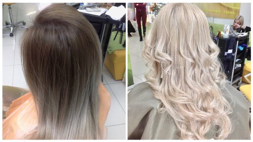 Осветление сильно отросшего корня и тонирование в платиновый холодный блондин, нейтрализация желтого оттенка. Обесцвечивание отросшего корня