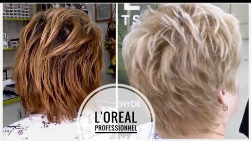 Осветление ранее окрашенных волос красителем L'Oreal Professionnel и короткая стрижка бритвой. Осветление волос без обесцвечивания