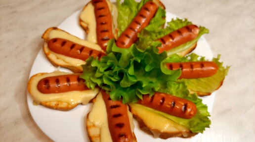 Завтрак на гриле из хлеба сыра сосиок и листьями салата.