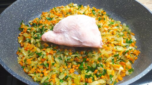 Нарезаем лук, морковь, насыпаем рис, кладем сверху курицу и получаем ужин в сковороде