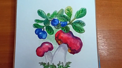Рисуем лесной пейзаж с грибами и голубикой акварелью