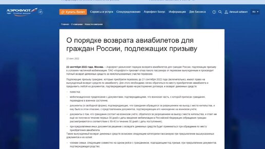 Аэрофлот вернет деньги за авиабилеты мобилизованным россиянам