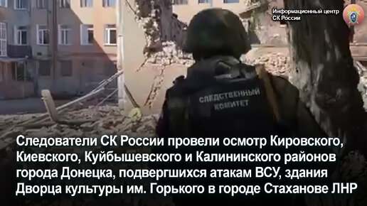 Сотрудники СК России зафиксировали последствия обстрелов Донецка и разрушения Дворца культуры в Стаханове
