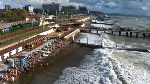 Адлер и ФТ Сириус с высоты птичьего полета: осенний шторм на пляжах Курортного Городка.