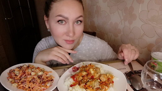 МУКБАНГ/КУРОЧКА С ОВОЩАМИ, РИС, ИНТЕРЕСНЫЙ САЛАТИК 😋👍