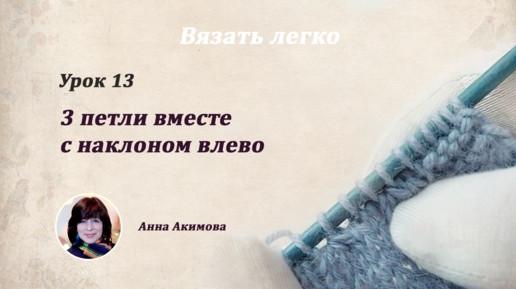 Урок 13: Три петли вместе с наклоном влево. Убавка спицами.