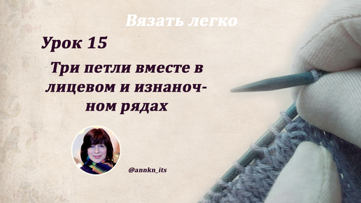 Урок 15: Три петли вместе без наклона в лицевых и изнаночных рядах. Убавки спицами.