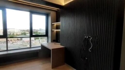Декоративные рейки из сосны с подсветкой + полки, стол и подоконник МДФ в шпоне ясеня, по индивидуальным размерам.