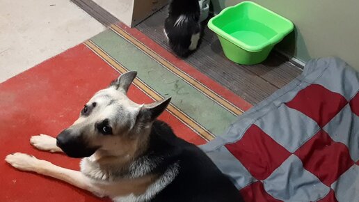 Коша после операции поедает собачью еду. Пес Дарик все терпеливо сносит