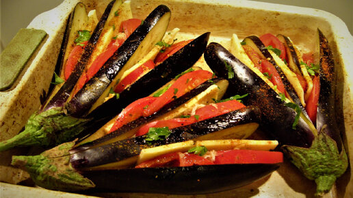 Запекаем баклажаны гармошкой с помидорами и сыром.
