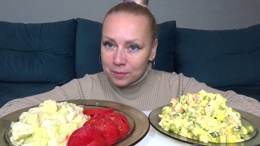 Салат Оливье с солеными огурцами. Картофельное пюре с тушеной курицей.Еда.