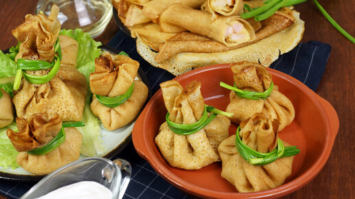 Ажурные блины с начинкой в мешковинке.