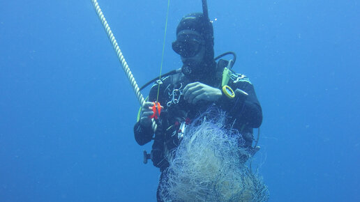 Убираем брошенную рыболовную сеть на дайвинге в Таиланде