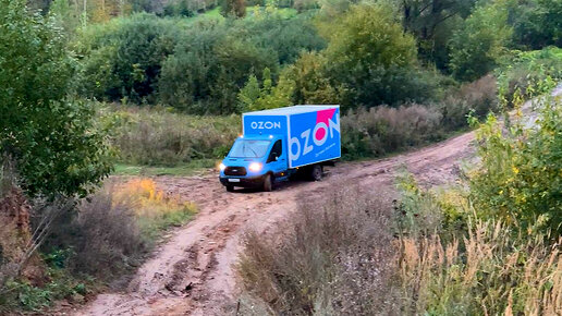 Фургон OZON объезжает пробку по бездорожью. Кажется чьи-то посылки будут помяты