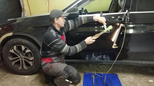 Ремонт вмятины и царапины на двери Мерседес. Без покраски!