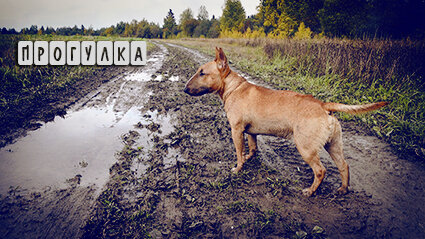 Бультерьер на прогулке ) Река, поля, леса, мухоморы )