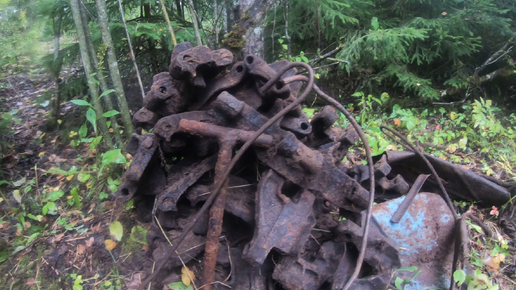 Нашли место стоянки тракторной бригады. Огромное колесо от танка.