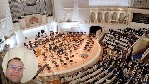 Вид с балкона на сцену большого зала Московской Филармонии, партер и амфитеатр 25.09.2022. На концерте музыки Дмитрия Шостаковича