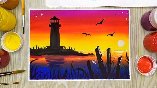 Как нарисовать закат на море с маяком гуашью. Рисуем гуашью для начинающих