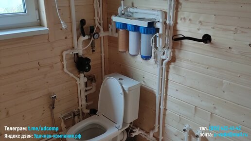Центральное водоснабжение с разводкой воды по дому. Фильтрация, легкая консервация, простой слив. Водонагреватель, унитаз. Работы за день.
