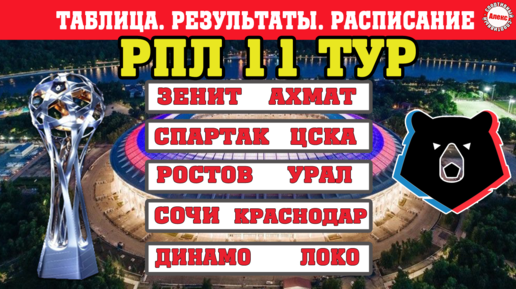 Чемпионат России по футболу (РПЛ). Результаты 11 тура. Расписание. Таблица.