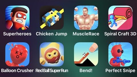 Superheroes, Chicken Jump, Muscle Race, Spiral Craft 3D, Balloon Crusher, Red Ball Super Run, Bend