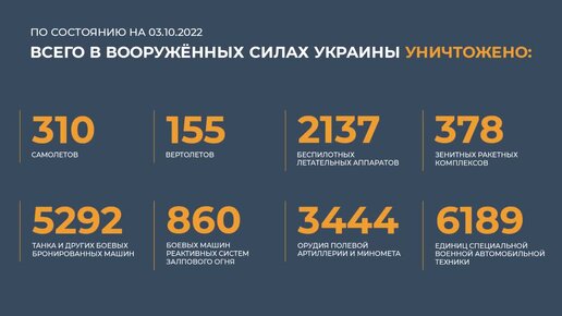 Сводка МО РФ о ходе СВО на территории Украины (по состоянию на 3 октября 2022 г.)