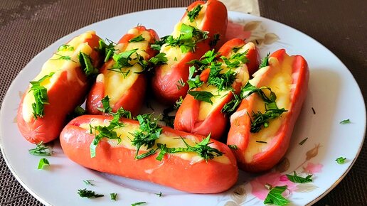 ДЛЯ ЛЮБИТЕЛЕЙ ПРОСТЫХ И БЫСТРЫХ БЛЮД.ГОТОВИМ ЗАПЕЧЕННЫЕ СОСИСКИ С НЕЖНЫМ ТАЮЩИМ СЫРОМ И ЗЕЛЕНЬЮ