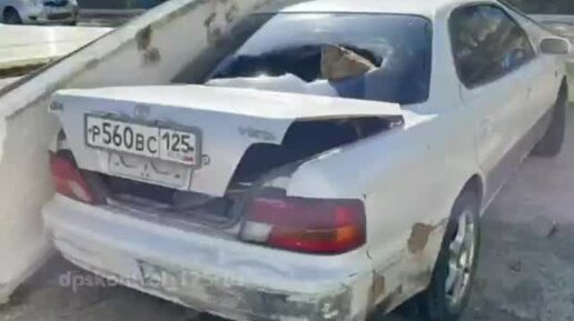 Во Владивостоке сильный ветер выкинул сэндвич-панель на припаркованный легковой автомобиль на ул. Шилкинская, 4а