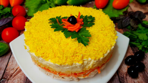 Праздничный слоеный салат «Бунито» из курицы, сыра, моркови по-корейски и яиц