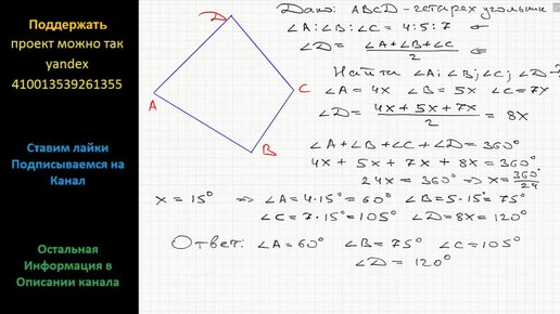 Геометрия Найдите углы четырех угольника, если три его угла пропорциональны числам 4, 5 и 7, а четвертый угол равен их полусумме.