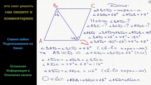 Геометрия Найдите углы параллелограмма ABCD (см. рис.), если угол ABD = 68, угол ADB = 47.