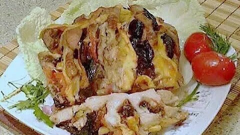 Свинина фаршированная черносливом, ананасом, сыром и запеченная в духовке.