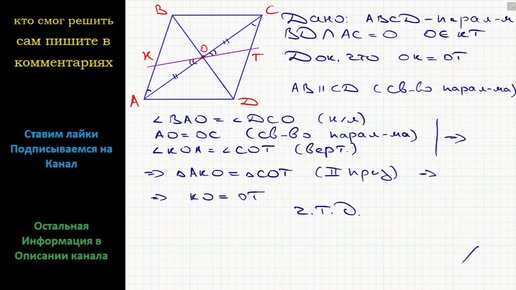 Геометрия Докажите, что любой отрезок, который проходит через точку пересечения диагоналей параллелограмма и концы которого принадлежат