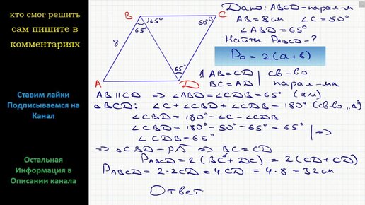 Геометрия Диагональ BD параллелограмма ABCD образует со стороной AB угол 65, угол C = 50, AB = 8 см. Найдите периметр параллелограмма
