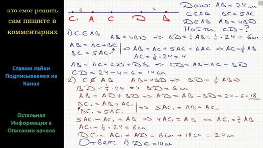 Геометрия Отрезок AB равен 24 см. Точка С принадлежит прямой AB, причем BC = 5AC. На отрезке AB отмечена точка D так, что AB = 4BD. Найдите