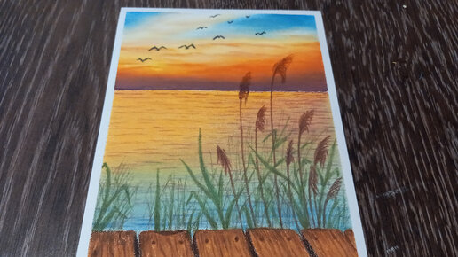 Как нарисовать закат на озере масляной пастелью.
