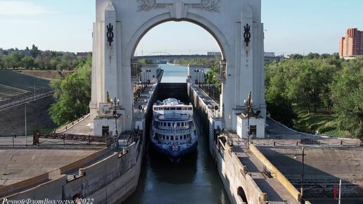 Пассажирский теплоход Александр Бенуа выходит из первого шлюза Волго-Донского Судоходного канала имени Ленина