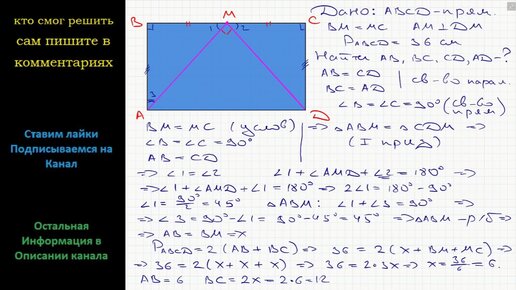 Геометрия Точка M – середина стороны BC прямоугольника ABCD, MA перпендикулярна MD, периметр прямоугольника равен 36 см. Найдите стороны