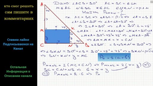 Геометрия В треугольнике ABC известно, что угол C = 90, AC = BC = 6 см. Прямоугольник CMKN построен так, что точка M принадлежит катету AC