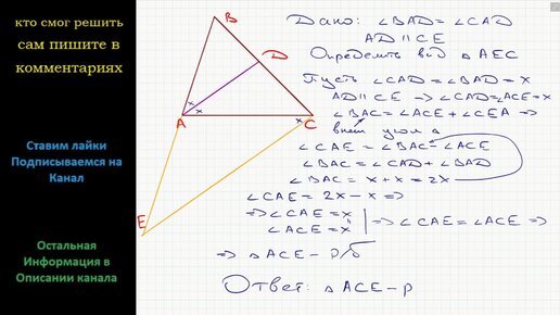 Геометрия Отрезок AD – биссектриса треугольника ABC. Через точку C проведена прямая, которая параллельна прямой AD и пересекает прямую AB
