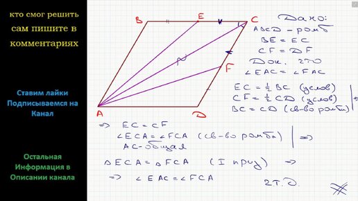 Геометрия Точки E и F – соответственно середины сторон BC и CD ромба ABCD. Докажите, что угол EAC = углу FAC