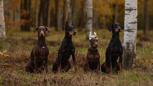Два черных и два коричневых добермана на прогулке