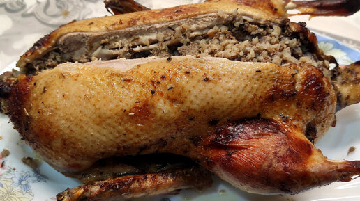 Утка в духовке, фаршированная гречкой с грибами и куриной печенкой.