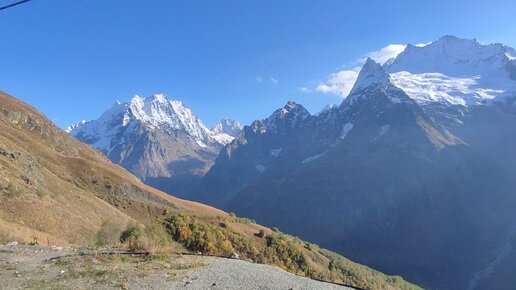 Едем на канатке в заснеженных горах Домбая осенью