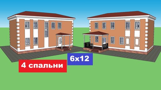 Проект двухэтажного дома 6 на 12 м. 4 спальни, терраса. Планировка дома 6х12 с расстановкой мебели.