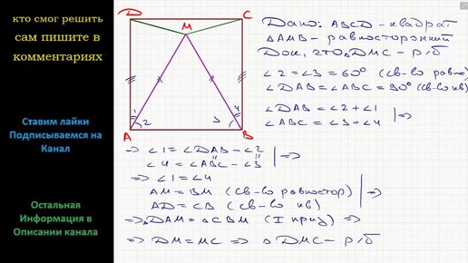 Геометрия В квадрате ABCD отметили точку M так, что треугольник AMB – равносторонний. Докажите, что треугольник CMD – равнобедренный