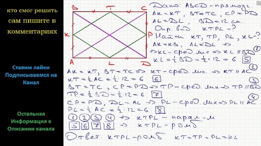 Геометрия Вершины четырехугольника являются середины сторон прямоугольника с диагональю 12 см Определите вид четырехугольника и найдите его